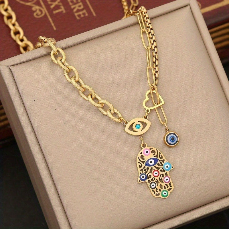 This necklace features a unique Hamsa hand and evil eye design, inspired by European and American ethnic fashion. Crafted from durable alloy, it offers a lightweight feel and eye-catching detail that’s perfect for everyday wear. The delicate collarbone-length chain makes it easy to layer or wear on its own, adding a bold yet elegant touch to any outfit.